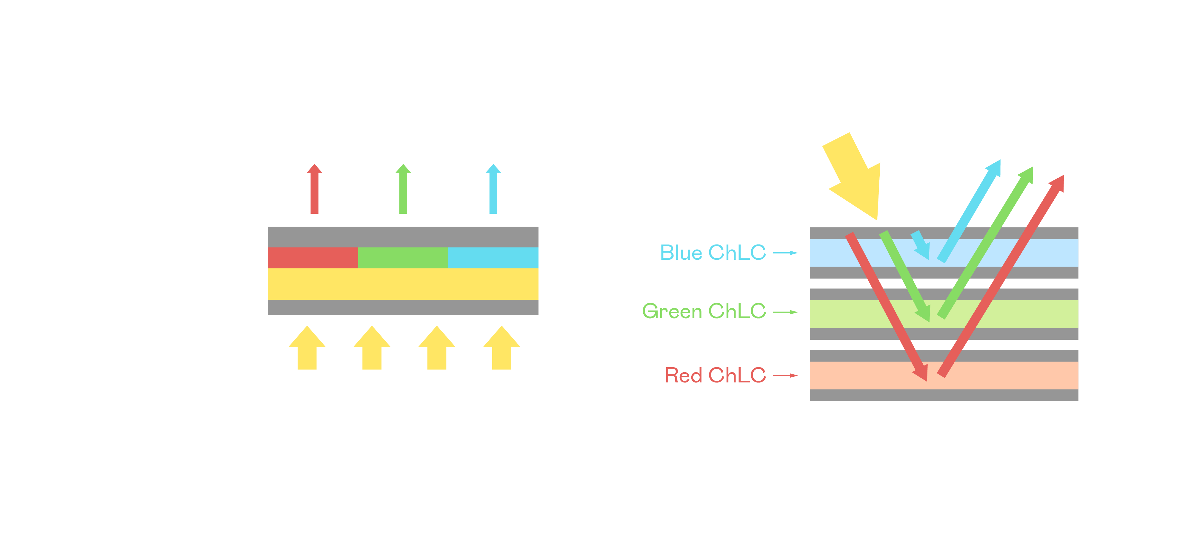 尊龙凯时胆固醇液晶显示器是由红、绿、蓝三层胆固醇液晶面板堆叠而成,并采用无彩色滤光片设计,减少环境光在反射过程中的损耗。